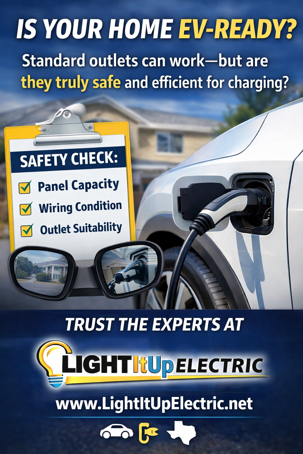 Most modern electric vehicles can be plugged into a standard 120-volt household outlet, but for many homeowners in Allen, TX, this setup may not be the safest or most efficient long-term solution. While basic charging works in a pinch, an outdated or overloaded electrical system can increase charging times and pose potential safety risks. Just like adjusting your car mirrors for maximum visibility and safety, it’s smart to perform a safety check on your home EV charging setup. A licensed electrician can inspect your electrical panel, wiring, and outlet capacity to ensure your home is properly equipped to handle EV charging demands. In many cases, upgrading your electrical system or installing a dedicated EV charging station can improve safety, reduce charging time, and protect your home’s electrical infrastructure. For Allen homeowners, a professional evaluation can provide peace of mind and prepare your home for the growing demands of electric vehicle ownership. Trust the local experts at Light It Up Electric for EV charger inspections, installations, and electrical upgrades in Allen, TX. Learn more or schedule an evaluation today at 👉 https://www.lightitupelectric.net
