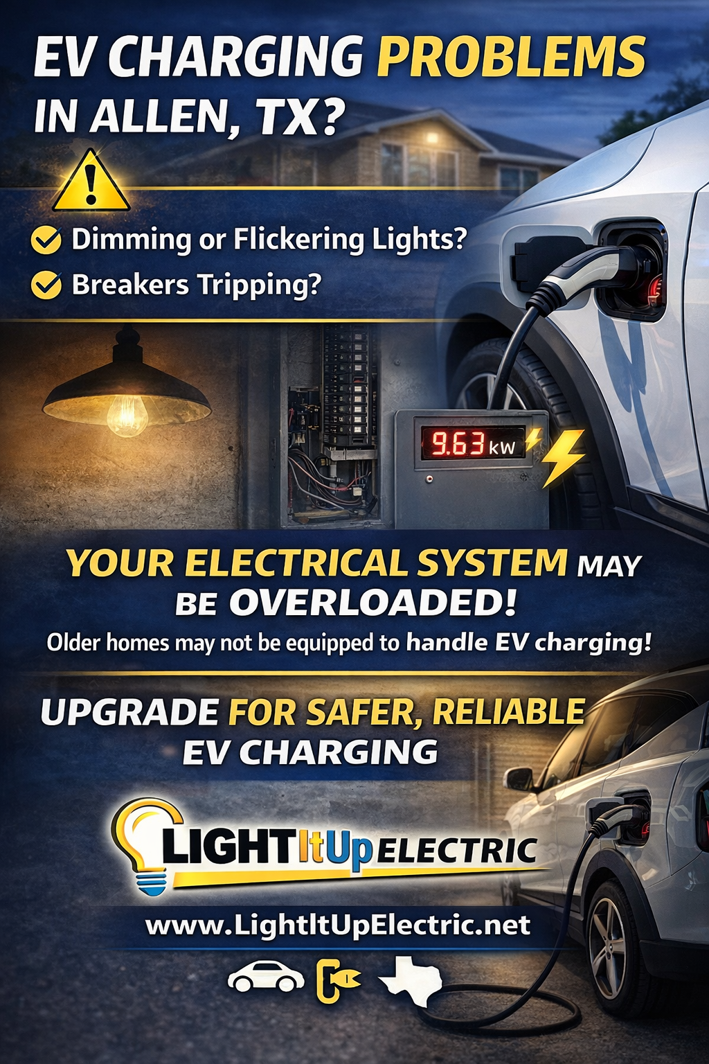 When charging an electric vehicle at home, warning signs like dimming lights or frequent circuit breaker trips often indicate that your home’s electrical system isn’t equipped to handle the added demand. This is a common issue in Allen, TX homes that are more than 20 years old, where electrical panels were not designed for modern power loads. Studies show that EV charging at 9.6 kW can double or even triple your home’s previous peak electrical load. Without sufficient electrical service, this increased demand can lead to power fluctuations, reduced system performance, and safety concerns—whether you’re charging during the day or overnight. Upgrading your home’s electrical system or installing a dedicated EV charging circuit can significantly improve both charging speed and overall electrical safety. A professional electrical evaluation ensures your panel, wiring, and circuits can safely support EV charging without disrupting power throughout your home. For homeowners in Allen, TX, Light It Up Electric provides expert EV charger installations and electrical panel upgrades designed to meet today’s energy demands. Schedule an evaluation or learn more at 👉 https://www.lightitupelectric.net