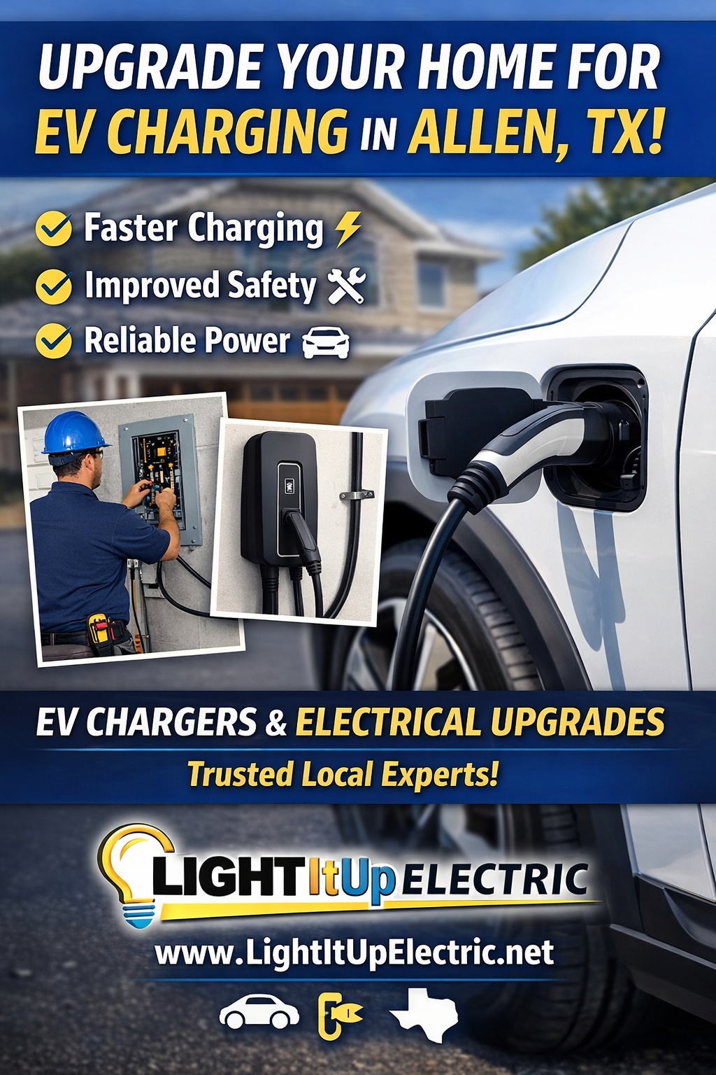 If you’re planning to purchase an electric vehicle, one of the most important decisions you’ll make is how you’ll charge it at home. For homeowners in Allen, TX, the most convenient and reliable solution is a professional EV charger installation at your residence. Public charging stations are becoming more common as electric vehicles gain popularity, but nothing compares to the convenience, safety, and peace of mind of having a dedicated in-home EV charging station (EVSE). With a home charger, you can recharge overnight, avoid long waits, and ensure your vehicle is always ready when you are. Most homeowners are not comfortable installing an EV charger themselves—and for good reason. According to surveys, 79% of U.S. homeowners do not feel confident installing an at-home EV charger on their own. Proper installation requires evaluating electrical panel capacity, wiring, permits, and safety requirements to ensure reliable operation. Interest in EV ownership continues to grow, with one in five homeowners planning to purchase or upgrade to an electric vehicle, and more than half stating they are likely to install a home charging station after buying an EV. This makes professional ev charger installation Allen TX an essential service for modern homeowners. At Light It Up Electric, we specialize in safe, code-compliant EV charger installations and electrical upgrades for homeowners in Allen, TX. Learn more or schedule your installation today at 👉 https://www.lightitupelectric.net