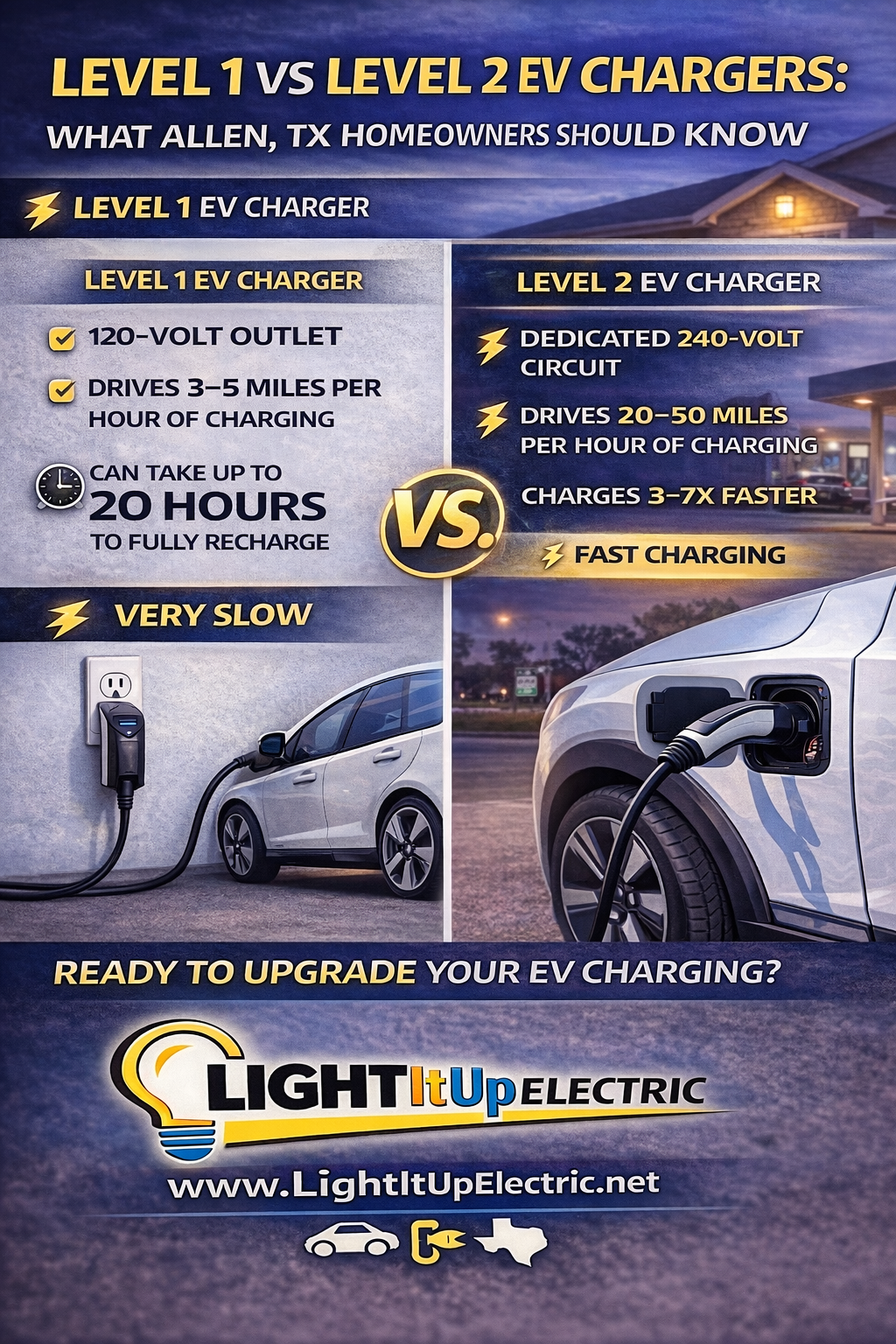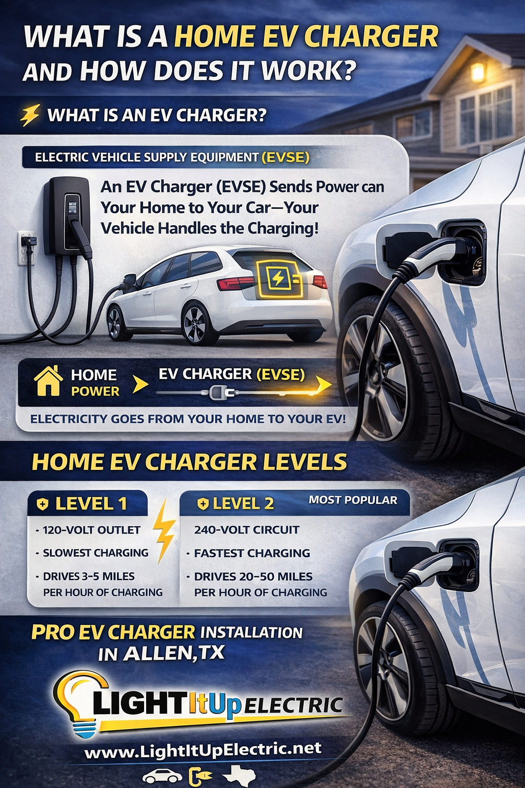 If you’re an electric vehicle owner—or planning to become one—understanding how a home EV charger works is essential. For homeowners in Allen, TX, installing the right EV charging solution can make daily driving more convenient, efficient, and reliable. Technically speaking, the actual charging equipment that converts electricity into usable power is built into your electric vehicle. What most people refer to as a “home EV charger” is officially called Electric Vehicle Supply Equipment (EVSE). The EVSE safely delivers electricity from your home’s electrical system to your vehicle, where it’s then converted and stored in the battery. EV Charger Levels Explained Home EV chargers come in different levels, and the level you choose determines how quickly your vehicle charges and what type of electrical infrastructure is required. Level 1 EV Charger Uses a standard 120-volt household outlet Slowest charging option Best for very light daily driving or overnight charging Level 2 EV Charger Uses a 240-volt circuit Charges significantly faster than Level 1 Most popular choice for homeowners Often requires professional installation and possible electrical panel upgrades Choosing the right EV charger level depends on your driving habits, vehicle type, and your home’s electrical capacity. A licensed electrician can evaluate your system and recommend the safest and most efficient solution. For professional EV charger installation and electrical upgrades in Allen, TX, trust the local experts at Light It Up Electric. Learn more or schedule a consultation at 👉 https://www.lightitupelectric.net