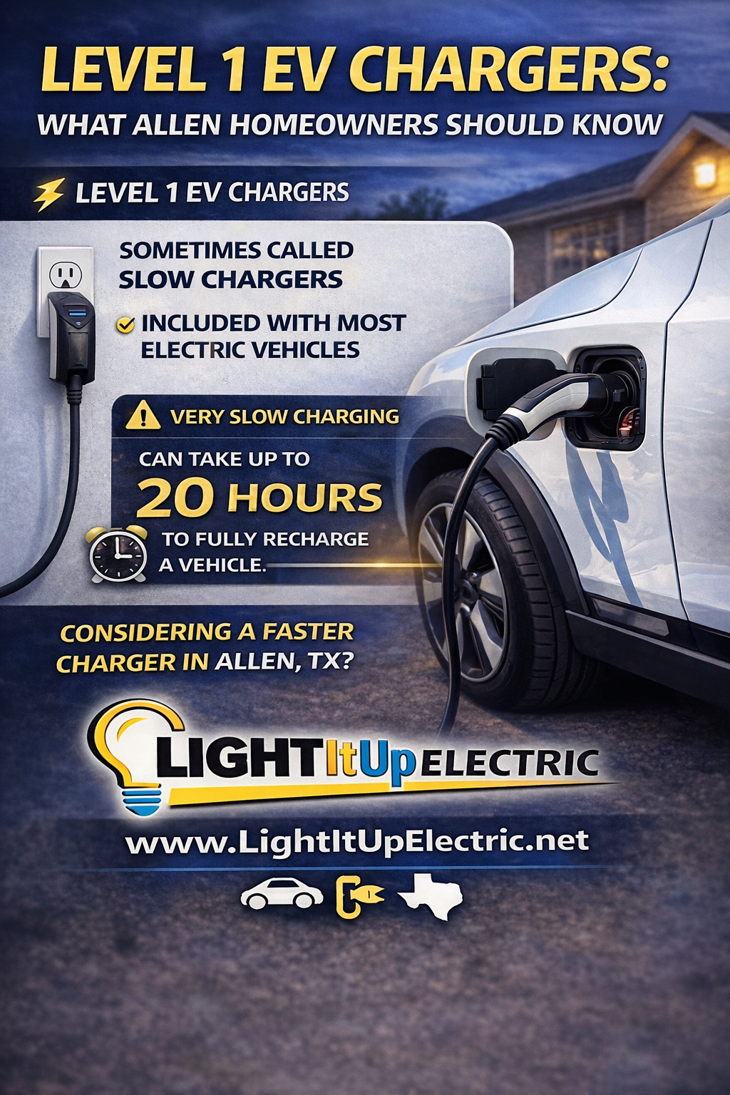 Level 1 EV Chargers: What Allen Homeowners Should Know Level 1 EV chargers—sometimes referred to as slow chargers—are typically included when you purchase an electric vehicle. These chargers plug directly into a standard 120-volt household outlet, making them the most basic and accessible EV charging option for homeowners in Allen, TX. Level 1 chargers generally provide 3 kW to 6 kW of power, which is enough for light daily driving but comes with a major drawback: charging speed. On average, fully recharging an electric vehicle with a Level 1 charger can take up to 20 hours, depending on battery size and vehicle model. Because of the long charging times, Level 1 chargers are best suited for drivers with short commutes or as a temporary charging solution. Many Allen homeowners eventually upgrade to a faster Level 2 charger for greater convenience and efficiency. If you’re unsure whether a Level 1 charger is right for your home—or you’re ready to explore faster charging options—Light It Up Electric can help. Our licensed electricians provide expert EV charger evaluations and installations in Allen, TX. Learn more at 👉 https://www.lightitupelectric.net