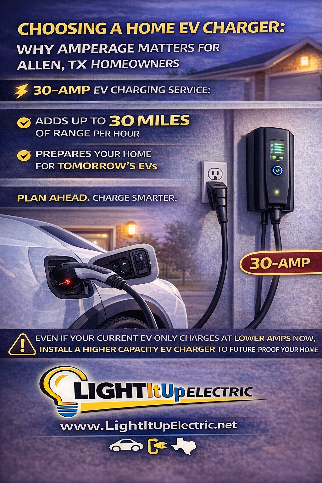 Choosing the Right Home EV Charger: Why Amperage Matters When selecting a home EV charger, most homeowners focus on charger level and charging speed—but those aren’t the only factors that matter. For homeowners in Allen, TX, understanding additional features like amperage capacity can help future-proof your investment and maximize convenience. 30-Amp EV Charging Service A 30-amp EV charging service offers a strong balance of performance and efficiency, with the ability to add up to 30 miles of driving range per hour of charging. This level of power is ideal for many daily driving needs and supports faster overnight charging. Even if your current electric vehicle can only accept 16-amp charging, installing a higher-capacity EVSE now can save you time and money later. As EV technology continues to evolve, newer vehicles often come equipped with faster onboard chargers. Choosing a higher-capacity EV charger today helps ensure you won’t need another upgrade when you purchase your next EV. A licensed electrician can evaluate your home’s electrical system and recommend the right EV charger based on your current vehicle, future plans, and available electrical capacity. For expert EV charger installation and electrical upgrades in Allen, TX, trust the local professionals at Light It Up Electric. Learn more at 👉 https://www.lightitupelectric.net