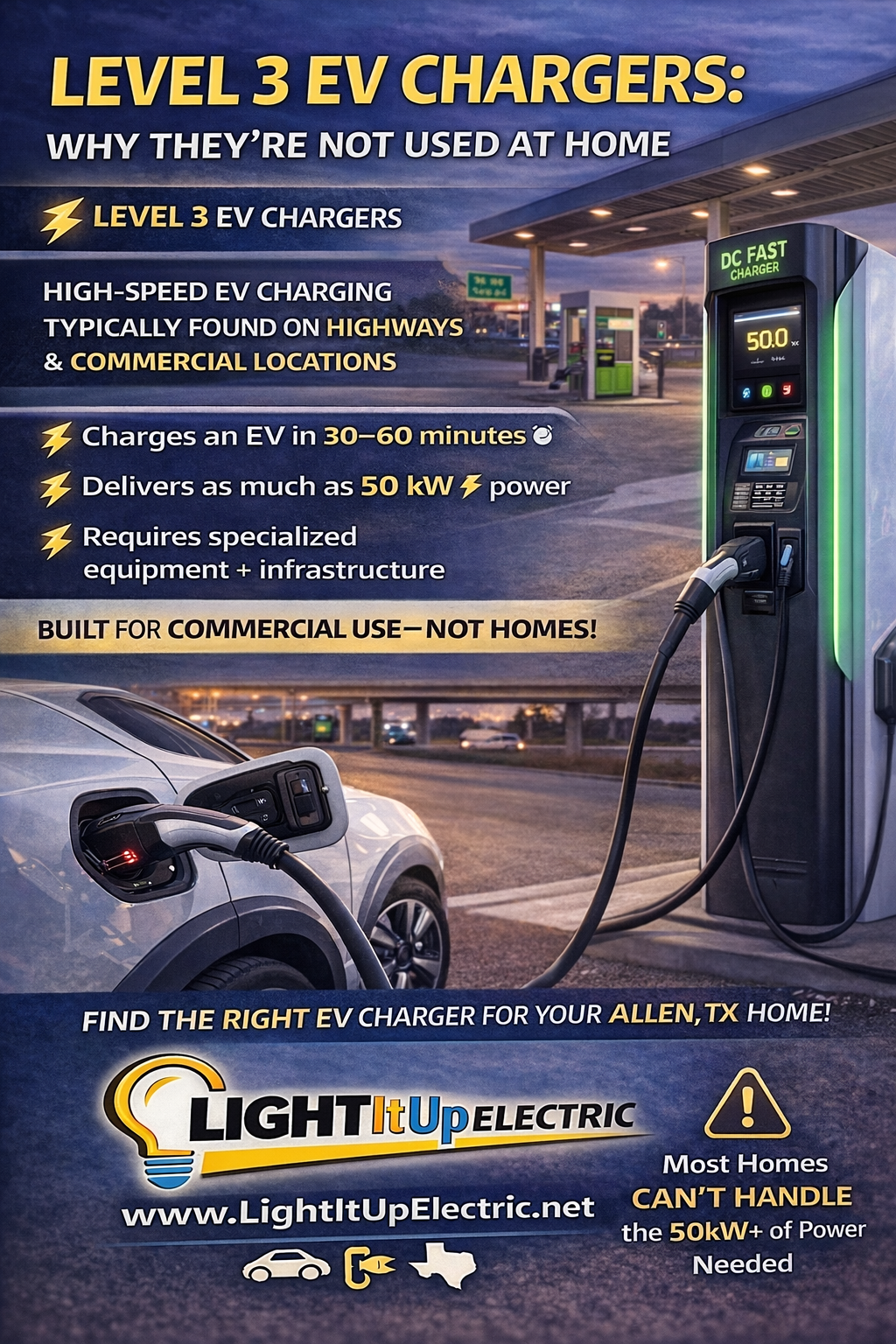 Level 3 EV Chargers: Why They’re Not Used at Home Level 3 EV chargers, often referred to as rapid chargers or DC fast chargers, are designed for high-speed charging—but they are not intended for residential use. For homeowners in Allen, TX, these chargers are typically encountered while traveling, not at home. Level 3 chargers deliver up to 50 kW of power or more, allowing an electric vehicle to recharge in as little as 30 minutes to one hour. Because of their extremely high electrical demand, these systems require specialized infrastructure, commercial-grade power supply, and significant electrical capacity—far beyond what a standard home can safely support. That’s why Level 3 EV chargers are most commonly found along major highways, shopping centers, and public charging stations, where they function much like traditional gas stations for electric vehicles. For residential EV charging in Allen, TX, Level 2 chargers provide the ideal balance of speed, safety, and practicality. If you’re unsure which charging option is best for your home, the licensed electricians at Light It Up Electric can help you choose and install the right solution. Learn more about home EV charging options at 👉 https://www.lightitupelectric.net