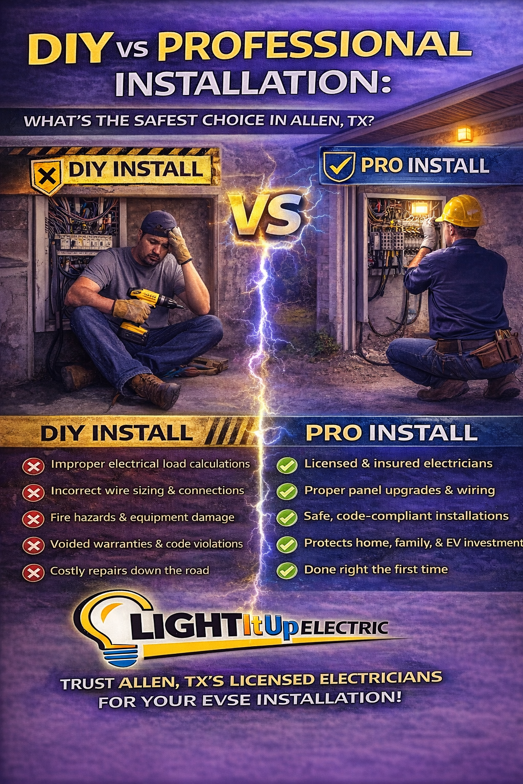 If you’re planning to purchase an electric vehicle, one of the most important decisions you’ll make is how you’ll charge it at home. For homeowners in Allen, TX, the most convenient and reliable solution is a professional EV charger installation at your residence. Public charging stations are becoming more common as electric vehicles gain popularity, but nothing compares to the convenience, safety, and peace of mind of having a dedicated in-home EV charging station (EVSE). With a home charger, you can recharge overnight, avoid long waits, and ensure your vehicle is always ready when you are. Most homeowners are not comfortable installing an EV charger themselves—and for good reason. According to surveys, 79% of U.S. homeowners do not feel confident installing an at-home EV charger on their own. Proper installation requires evaluating electrical panel capacity, wiring, permits, and safety requirements to ensure reliable operation. Interest in EV ownership continues to grow, with one in five homeowners planning to purchase or upgrade to an electric vehicle, and more than half stating they are likely to install a home charging station after buying an EV. This makes professional ev charger installation Allen TX an essential service for modern homeowners. At Light It Up Electric, we specialize in safe, code-compliant EV charger installations and electrical upgrades for homeowners in Allen, TX. Learn more or schedule your installation today at 👉 https://www.lightitupelectric.net