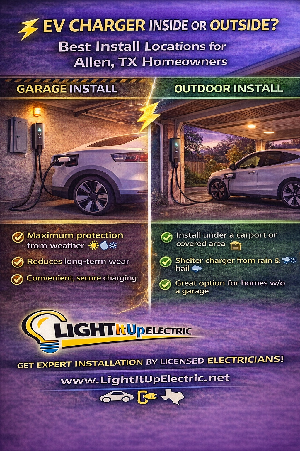 One of the most common questions homeowners ask is whether their EV charger should be installed inside or outside the home. For most homeowners in Allen, TX, installing the EV charger inside the garage is the preferred option. Garage installations provide added protection from heat, rain, hail, and other Texas weather conditions. While most modern EV chargers are built to withstand outdoor environments, installing the unit indoors helps reduce long-term wear, minimize exposure to moisture, and extend the life of the equipment. If your home does not have a garage, installing your EV charger under a carport or covered parking area is a smart alternative. A covered space offers additional protection from the elements while maintaining convenient access to your vehicle. Choosing the right installation location depends on your parking layout, electrical panel placement, and daily driving habits. A licensed electrician can evaluate your home and recommend the safest, most efficient installation option. For professional EV charger installation in Allen, TX, trust the experienced electricians at Light It Up Electric. Schedule your consultation today at 👉 https://www.lightitupelectric.net