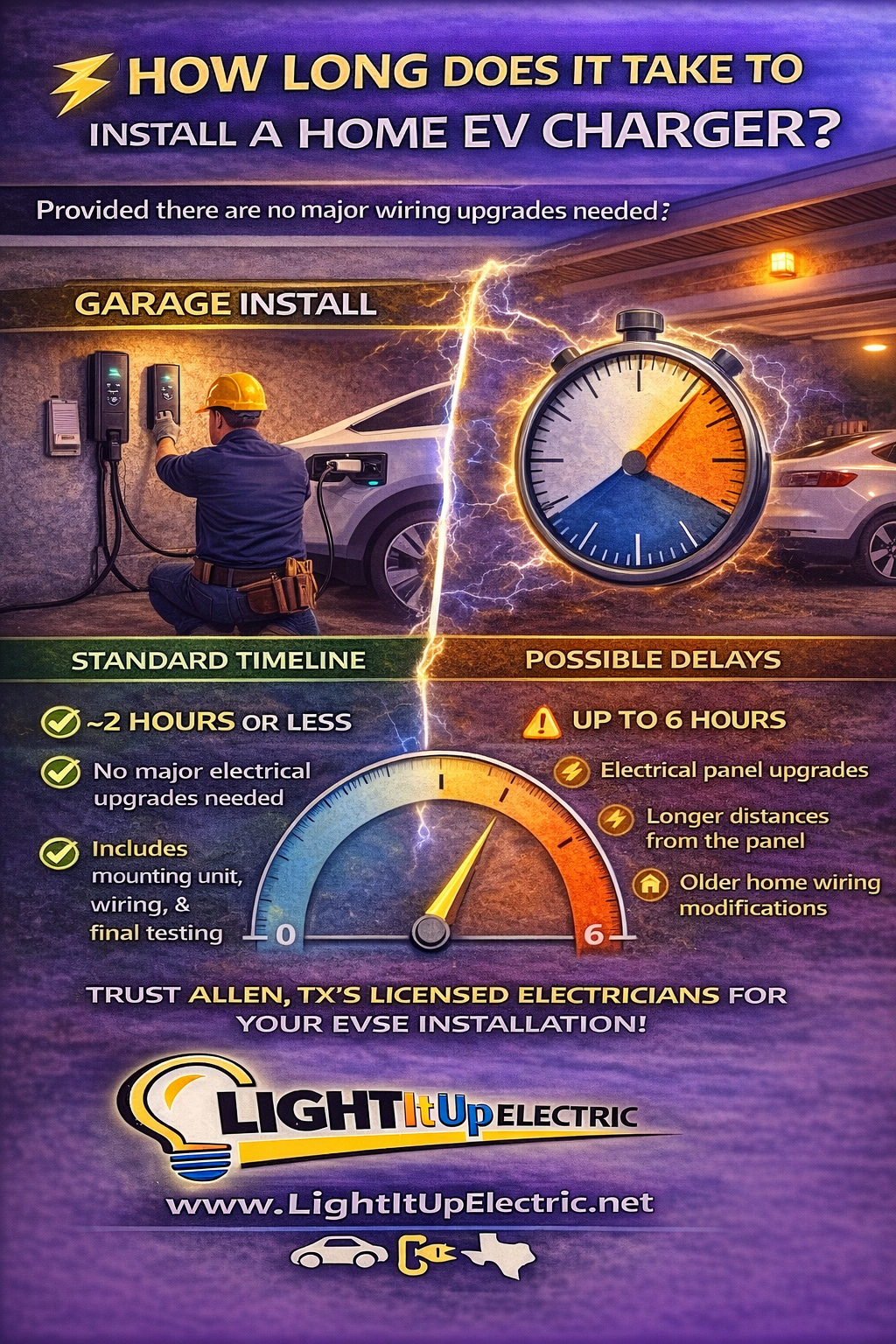 How Long Does It Take to Install a Home EV Charger? One of the most common questions homeowners in Allen, TX ask is: How long does EV charger installation take? In most cases, a standard home EV charger installation takes two hours or less, provided that no major electrical upgrades are required. This typically includes mounting the charger, installing a dedicated circuit, and completing final testing to ensure safe operation. However, if your home requires electrical panel upgrades, wiring modifications, or additional load calculations, installation can take up to six hours or more. Older homes, detached garages, or outdated electrical systems may require additional time to ensure everything is code-compliant and safe. The exact timeline depends on: Your home’s electrical capacity Distance from panel to charger location Whether permits or upgrades are required Garage vs. outdoor installation A licensed electrician can evaluate your home and provide an accurate estimate before installation begins. For fast, safe, and professional EV charger installation in Allen, TX, trust the experienced team at Light It Up Electric. Schedule your installation today 👉 https://www.lightitupelectric.net