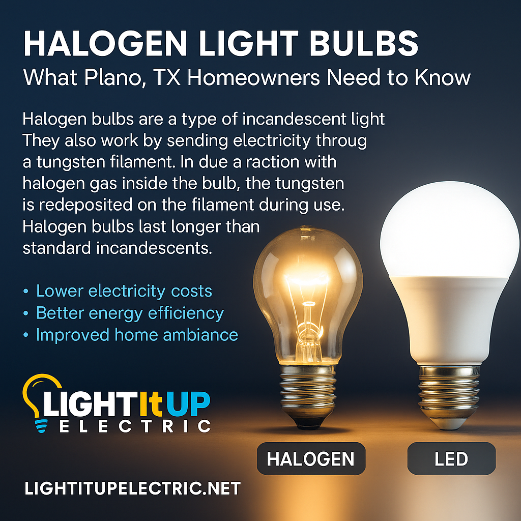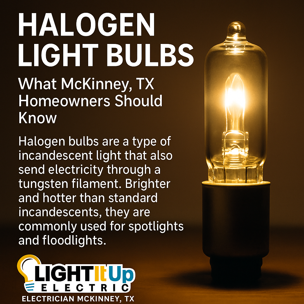 Halogen bulbs are a popular choice for homeowners in McKinney, TX who need bright, focused lighting. Because halogens are brighter than standard incandescent bulbs, they are commonly used in spotlights, floodlights, and task lighting where strong illumination is essential. Unlike traditional incandescents, halogen bulbs burn hotter and are somewhat more energy-efficient, making them a better option for areas that demand powerful light output. At Light It Up Electric – Electrician McKinney, TX , our licensed electricians can help you determine if halogen lighting is right for your home or guide you toward even more efficient solutions like LEDs for long-term energy savings and lower maintenance costs.