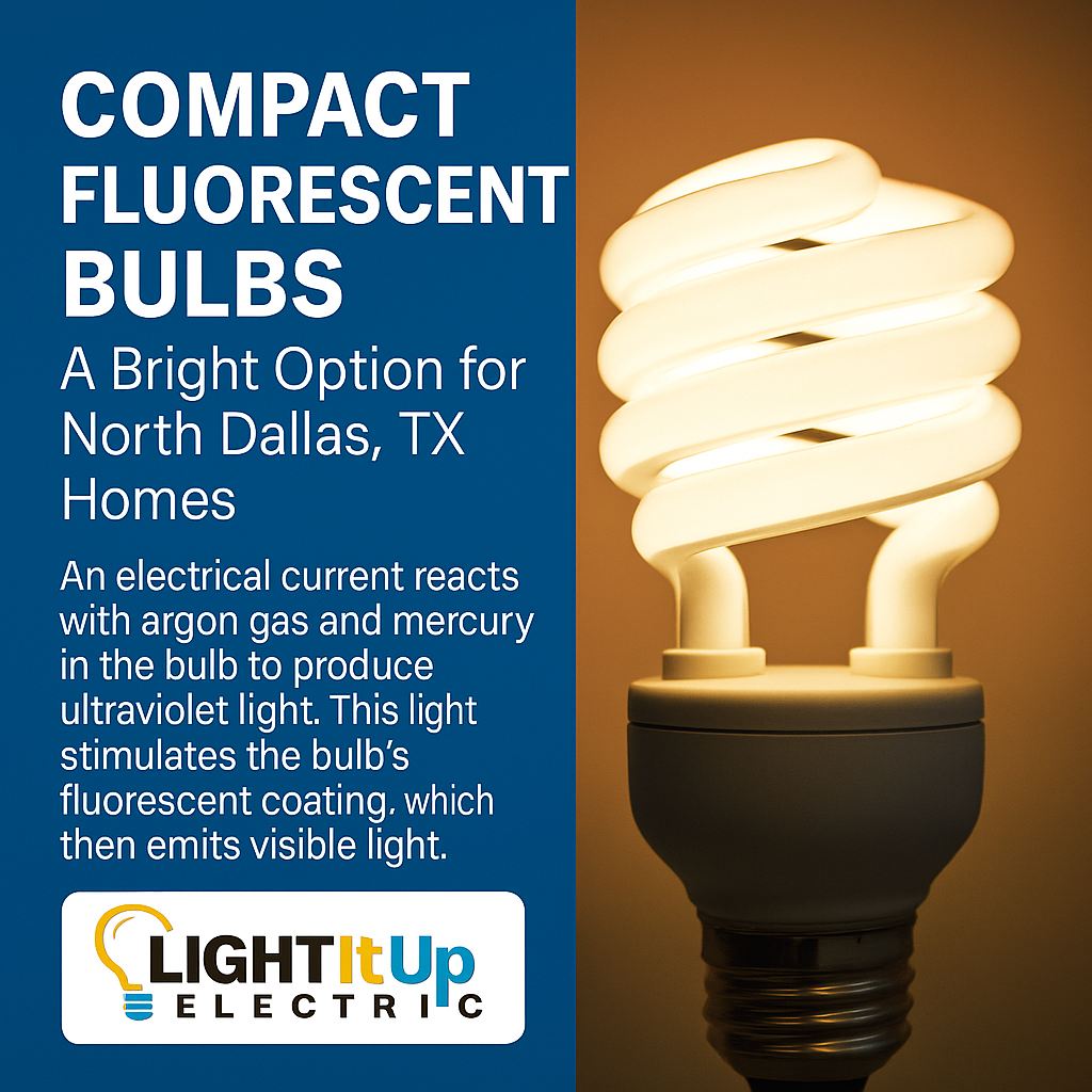 Compact fluorescent light bulbs (CFLs) are a more energy-efficient alternative to traditional incandescent and halogen bulbs, making them a smart choice for North Dallas homeowners looking to cut energy costs. Unlike incandescent and halogen bulbs, CFLs create light differently. When an electrical current passes through the bulb, it reacts with argon gas and a small amount of mercury, producing ultraviolet light. This UV light then stimulates the bulb’s fluorescent coating, which emits the visible light that illuminates your home. At Light It Up Electric – North Dallas Electrician , our licensed electricians can help you upgrade your home’s lighting with energy-efficient CFLs or LEDs, reducing electricity bills while keeping your home bright and comfortable.