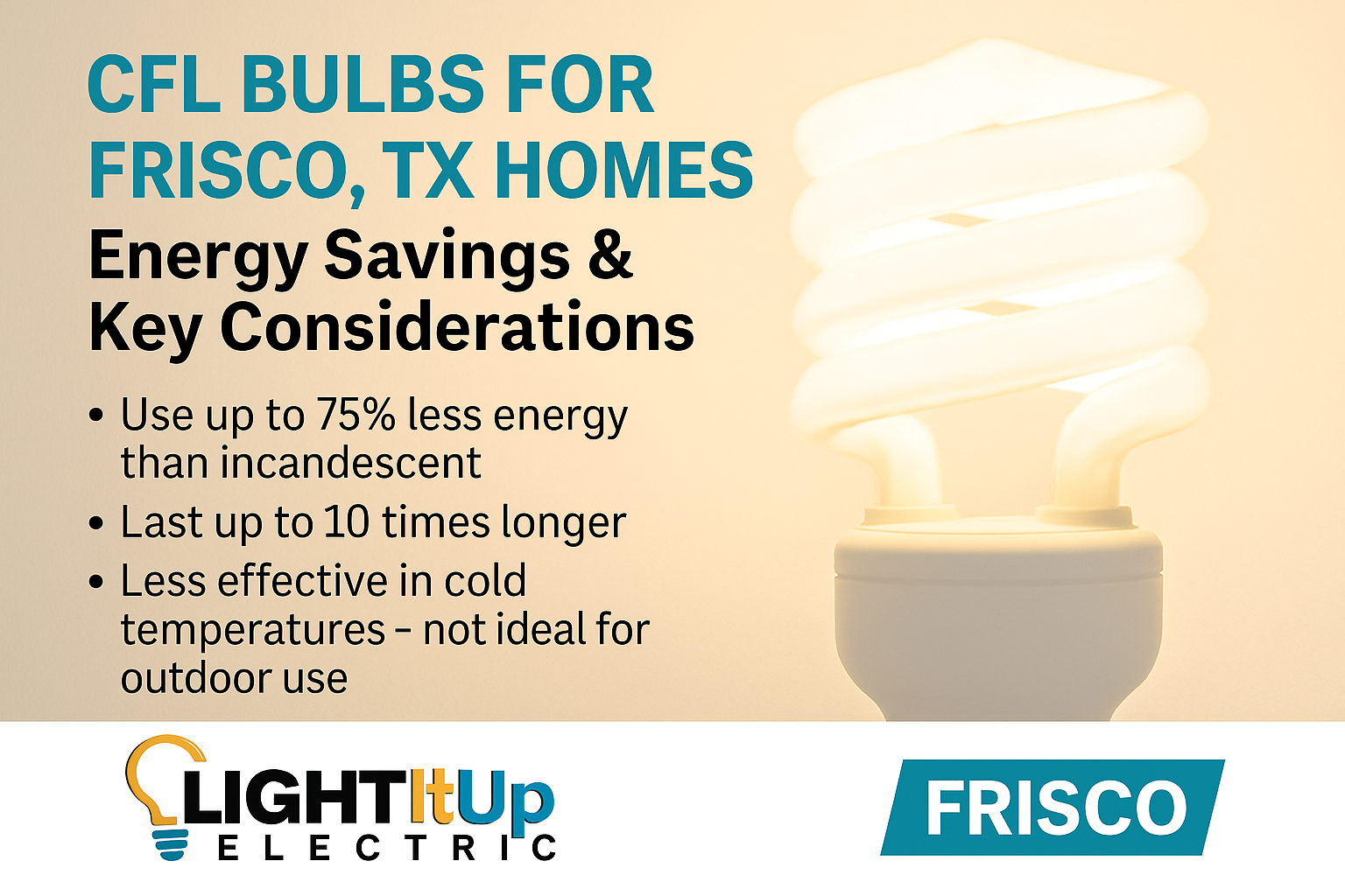 According to the U.S. Department of Energy, compact fluorescent light (CFL) bulbs use up to 75% less energy than traditional incandescent bulbs and last up to 10 times longer. This makes CFLs a smart choice for Frisco homeowners who want to lower electricity bills and reduce their carbon footprint. However, CFLs have some limitations. Their efficiency decreases in cold temperatures, making them less ideal for outdoor use, especially during winter. At Light It Up Electric , our licensed electricians help Frisco homeowners choose the best lighting solutions—whether that means CFLs for indoor efficiency or LEDs for versatile, year-round performance.