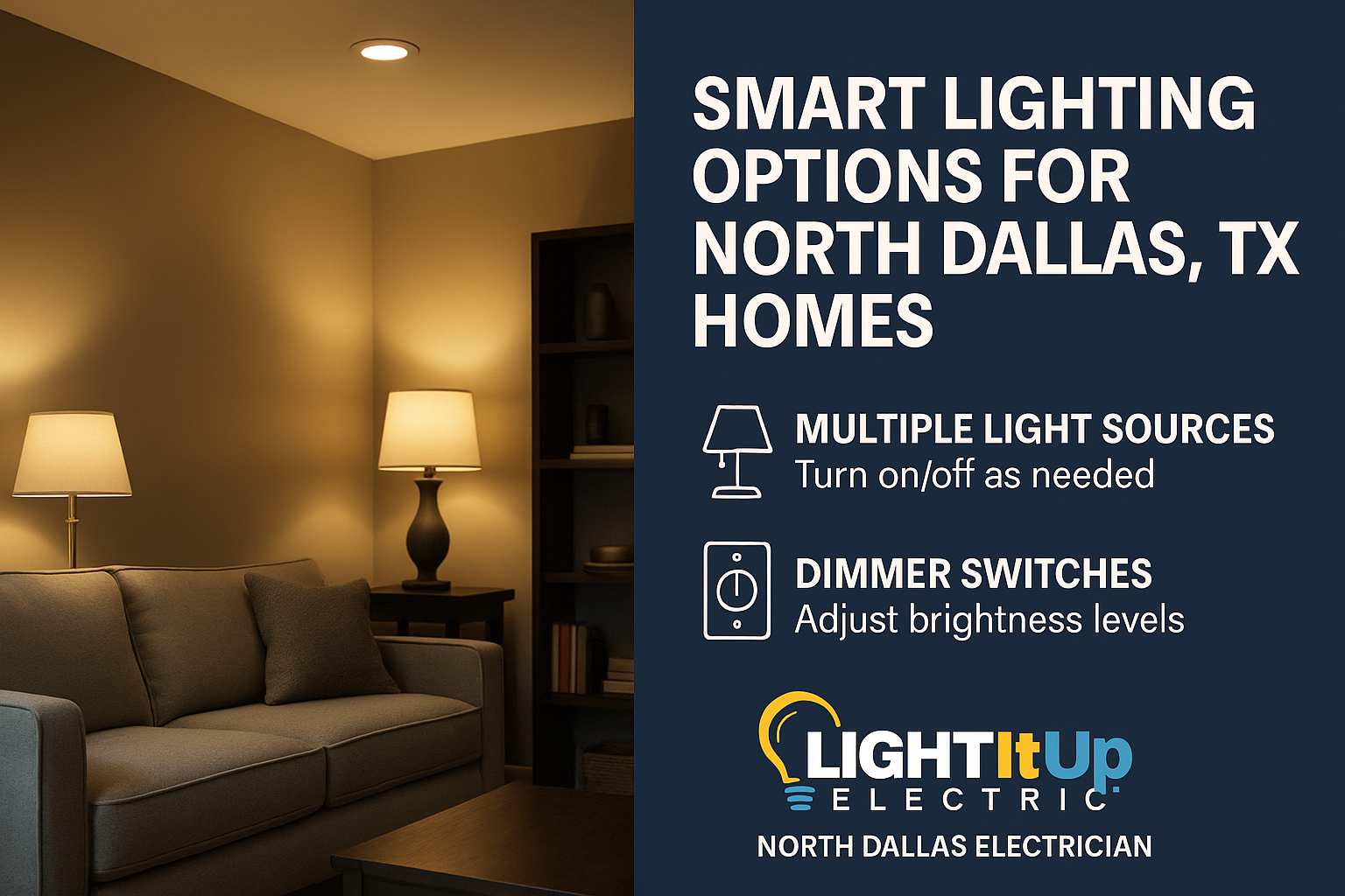 When it comes to creating the right atmosphere in your home, flexibility is key. Instead of relying on a single overhead light, multiple light sources give you the option to brighten or dim different areas as needed. For example, you may only need one lamp turned on while reading, while another family member enjoys television in the same room. Another great solution is installing dimmer switches. At Light It Up Electric – North Dallas Electrician , we help homeowners design adjustable lighting systems that improve comfort, save energy, and fit your lifestyle perfectly. Whether you need task lighting for work, soft lighting for relaxation, or energy-efficient upgrades, our licensed electricians can customize the ideal solution for your North Dallas home.