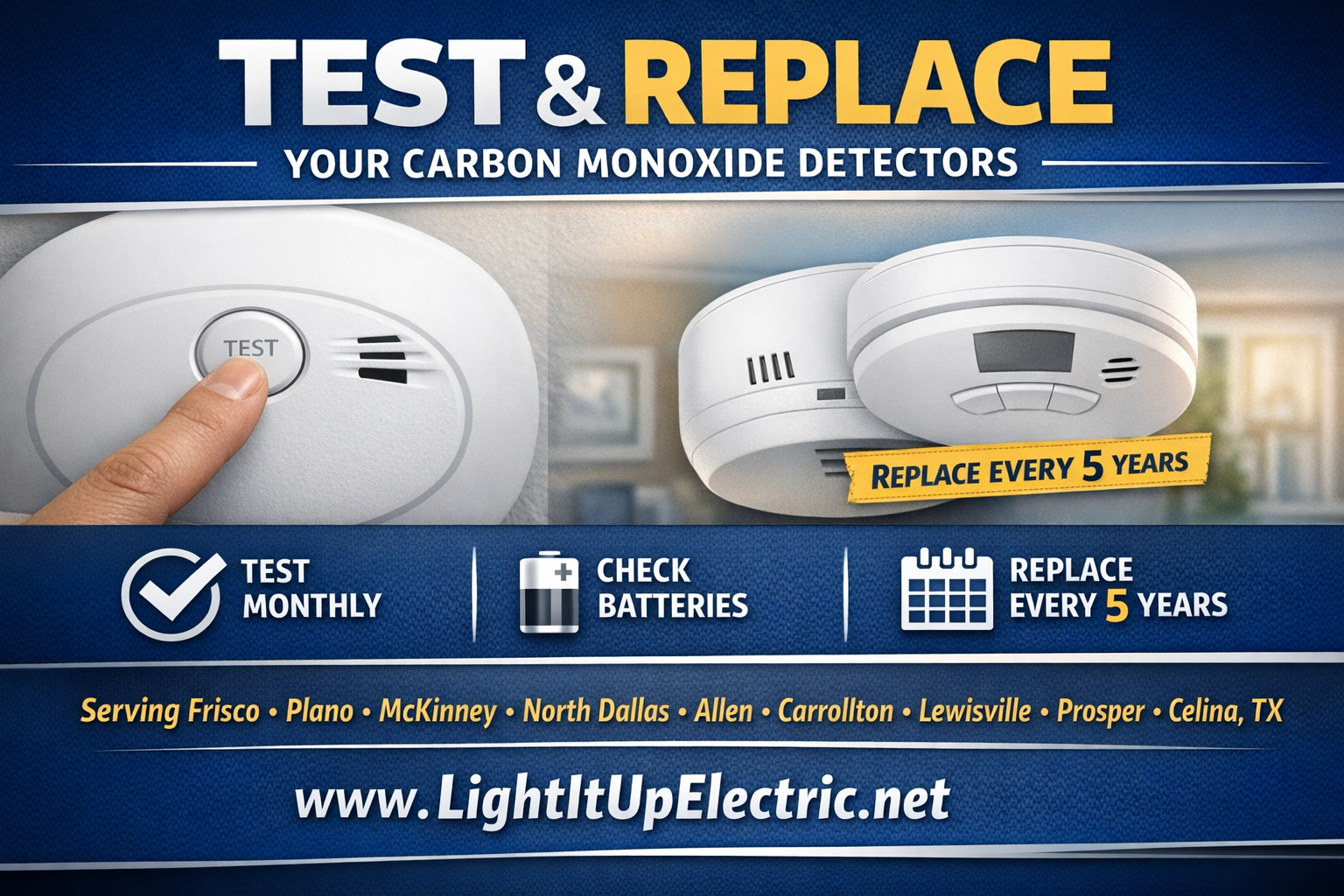 Test Carbon Monoxide Detectors Monthly to Keep Your Home or Business Safe Carbon Monoxide Safety Tips for Frisco, Plano, McKinney & North Dallas, TX Regularly testing your carbon monoxide (CO) detectors is one of the simplest ways to protect your home or business from dangerous carbon monoxide exposure. A quick press of the test button once a month helps ensure your detectors are working properly and ready to alert you if carbon monoxide levels become unsafe. For homeowners and businesses in Frisco, Plano, McKinney, North Dallas, Allen, Carrollton, Lewisville, Prosper, and Celina, TX, routine testing and timely replacement of detectors can provide peace of mind and help maintain a safer indoor environment. Why Monthly Testing Is Important Carbon monoxide is a colorless, odorless gas that can build up indoors without warning. A working detector is often the only way to know when dangerous levels are present. Monthly testing helps ensure: Your detector has power The alarm system is functioning correctly Batteries are still working The unit hasn’t been damaged or disconnected This quick safety check takes only seconds but can make a significant difference in protecting your family, employees, and customers. Replace Carbon Monoxide Detectors When Needed Even well-maintained detectors do not last forever. Most carbon monoxide detectors should be replaced every 5 years or according to the manufacturer’s recommendations. Signs it may be time for a replacement include: Frequent chirping or warning signals A detector that fails the test button check Units older than the recommended lifespan Keeping detectors up to date ensures they can accurately detect dangerous CO levels. Carbon Monoxide Detector Installation in North Texas Professional installation ensures carbon monoxide detectors are placed in the correct locations and connected properly for reliable protection. Light It Up Electric provides professional carbon monoxide detector installation, replacement, and electrical safety inspections for homes and businesses throughout: Frisco • Plano • McKinney • North Dallas • Allen • Carrollton • Lewisville • Prosper • Celina, TX Our licensed electricians help ensure your property has dependable carbon monoxide detection systems to keep your family, employees, and customers safe. Learn more or schedule service today: 👉 https://www.lightitupelectric.net Staying ahead of potential risks keeps your property safer and helps prevent those unexpected alarm beeps.