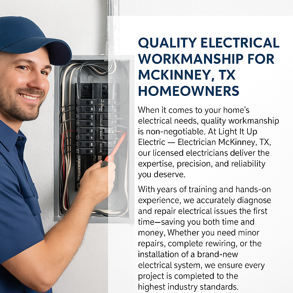 When it comes to your home’s electrical needs, quality workmanship is non-negotiable. At Light It Up Electric – Electrician McKinney, TX, our licensed electricians deliver the expertise, precision, and reliability you deserve.