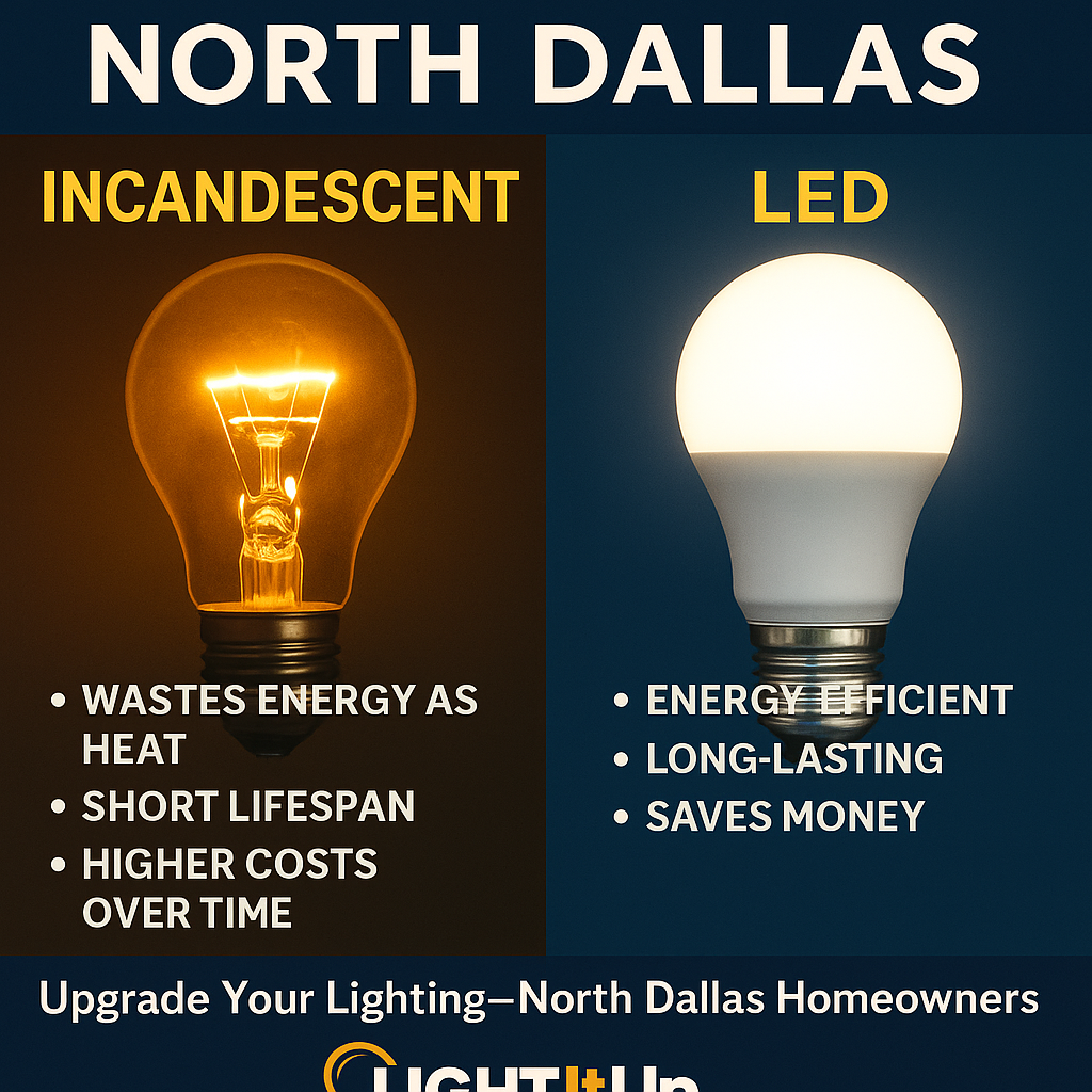 Incandescent bulbs may provide a warm, familiar glow, but they are far from the most efficient choice for your home. A significant portion of the energy they consume is wasted as heat—something you’ve likely noticed if you’ve ever touched one while it was still on. In addition, the tungsten filament inside deteriorates quickly, giving incandescent bulbs a much shorter lifespan compared to modern alternatives. At Light It Up Electric – North Dallas Electrician , we help homeowners transition from outdated incandescent bulbs to LEDs and other energy-efficient lighting solutions. By upgrading, you’ll enjoy: Lower energy bills thanks to efficient light output. Longer-lasting bulbs that reduce replacement costs. Improved safety and comfort with cooler operation and consistent lighting. Switching to modern lighting not only saves money but also helps create a brighter, greener, and more reliable home in North Dallas.