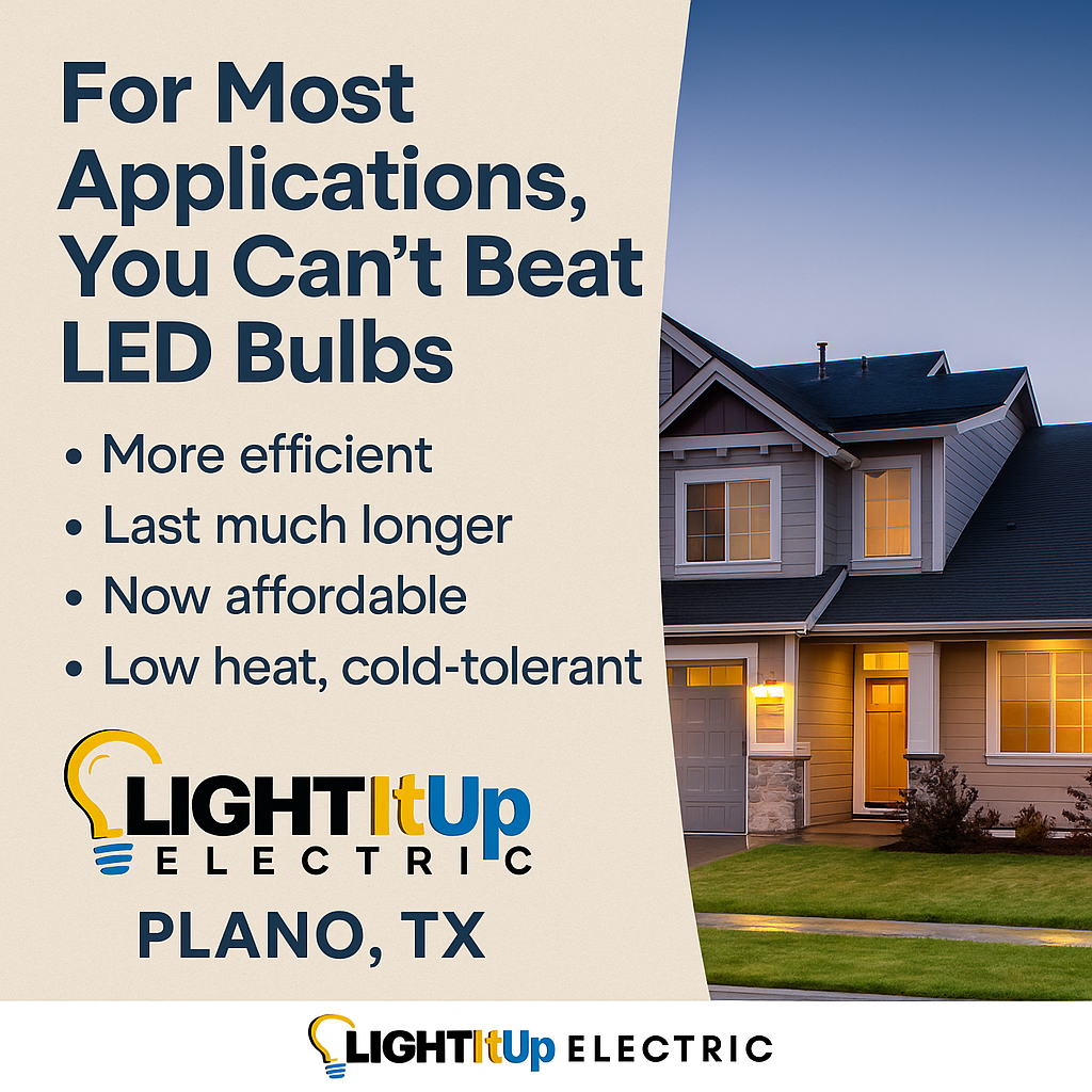 For most home lighting needs, LED bulbs are the best choice for Plano homeowners. These modern lights are far more energy-efficient than traditional bulbs, helping you save on electricity bills every month. LEDs also have an exceptionally long lifespan, so you won’t have to replace them as often—saving time and money. Once considered expensive, LED prices have dropped, making them as affordable as CFL and incandescent options. Another major advantage: LEDs generate very little heat and perform exceptionally well in cold temperatures, making them perfect for both indoor and outdoor use year-round. At Light It Up Electric – Electrician Plano, TX , our licensed electricians can upgrade your home with professional LED installations that enhance energy efficiency, reduce maintenance, and keep your home beautifully lit in every season.