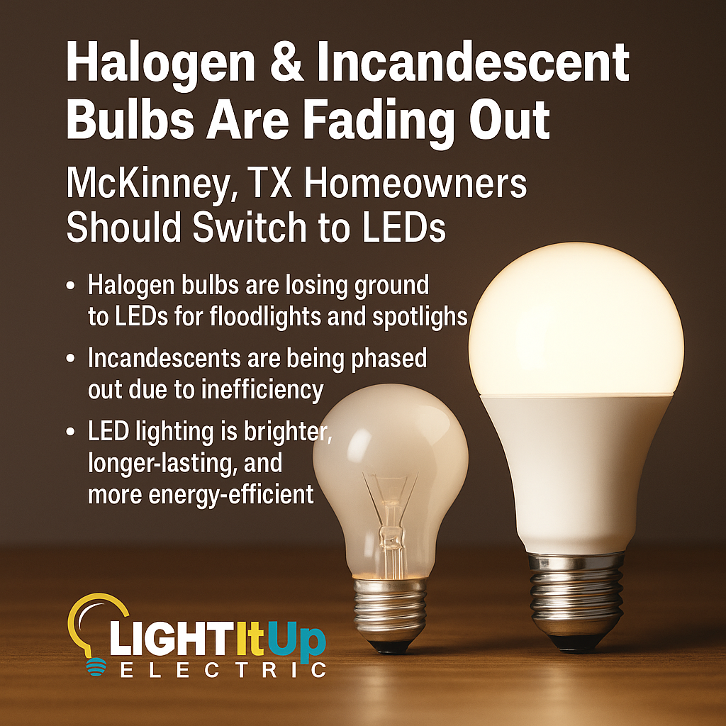 Halogen bulbs have long been a popular choice for floodlights and spotlights, but as LED technology continues to advance, their dominance is quickly coming to an end. Traditional incandescent bulbs are also on their way out, with many types already banned or being phased out due to their low energy efficiency and short lifespan. Today, LED lighting offers McKinney homeowners a brighter, longer-lasting, and more energy-efficient alternative for every lighting need—indoors or outdoors. At Light It Up Electric – Electrician McKinney, TX , our licensed electricians specialize in LED lighting upgrades. We help homeowners replace outdated halogen and incandescent bulbs with modern, eco-friendly LED solutions that save money and reduce maintenance.