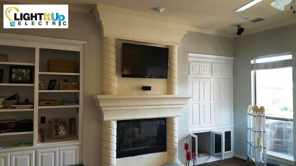 We can mount your flat panel TV and install an electrical outlet & cable outlet behind the TV so no cords will show. Electrical Outlets for LCD or DLP Projectors can be installed on the ceiling next to your projector as well.