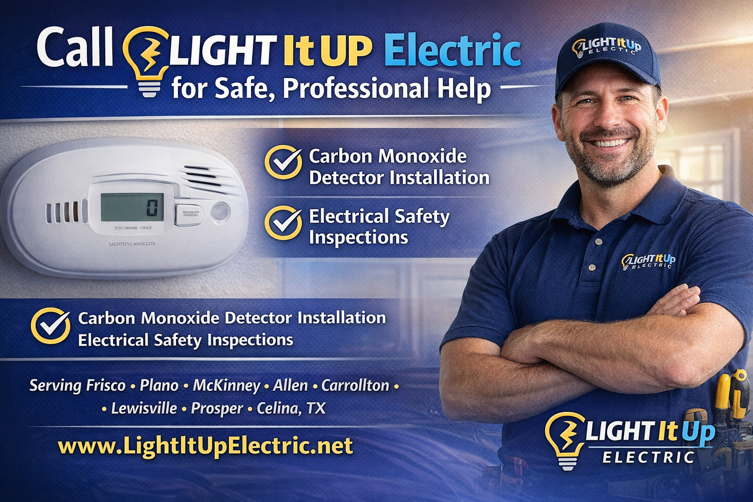 Carbon Monoxide Alarm Sounding? What a Continuous Beep Means Emergency CO Detection in Frisco, Plano, McKinney & North Dallas, TX If your carbon monoxide detector is sounding in a continuous, repeating pattern — typically four quick beeps followed by a pause — this is not a maintenance alert. This pattern usually means the alarm is actively detecting carbon monoxide (CO) in the air. For homeowners and business owners in Frisco, Plano, McKinney, North Dallas, Allen, Carrollton, Lewisville, Prosper, and Celina, TX, this is a serious emergency that requires immediate action. What To Do If Your CO Alarm Is Sounding If your carbon monoxide detector is going off in a repeating four-beep pattern: Leave the building immediately. Get everyone — family members, employees, customers, and pets — outside to fresh air. Call emergency services (911). Report a possible carbon monoxide leak. Do NOT re-enter the property. Only return once emergency responders say it is safe. Carbon monoxide is invisible, odorless, and potentially deadly. It reduces the body’s ability to carry oxygen and can quickly cause dizziness, confusion, unconsciousness, and worse. Why Immediate Action Matters CO can build up from common sources such as: Gas furnaces Water heaters Fireplaces Gas stoves Generators Vehicles running in enclosed garages If equipment malfunctions or ventilation fails, dangerous levels can accumulate quickly inside homes and commercial buildings. After the Emergency: Professional Inspection in North Texas Once emergency responders confirm safety, it’s critical to identify and fix the source of the problem. Light It Up Electric provides professional carbon monoxide detector inspection, replacement, and electrical troubleshooting throughout: Frisco • Plano • McKinney • North Dallas • Allen • Carrollton • Lewisville • Prosper • Celina, TX We ensure your carbon monoxide detectors are properly installed, functioning correctly, and compliant with safety standards to protect your home or business. Schedule service or learn more: 👉 https://www.lightitupelectric.net When it comes to carbon monoxide, never ignore the alarm.